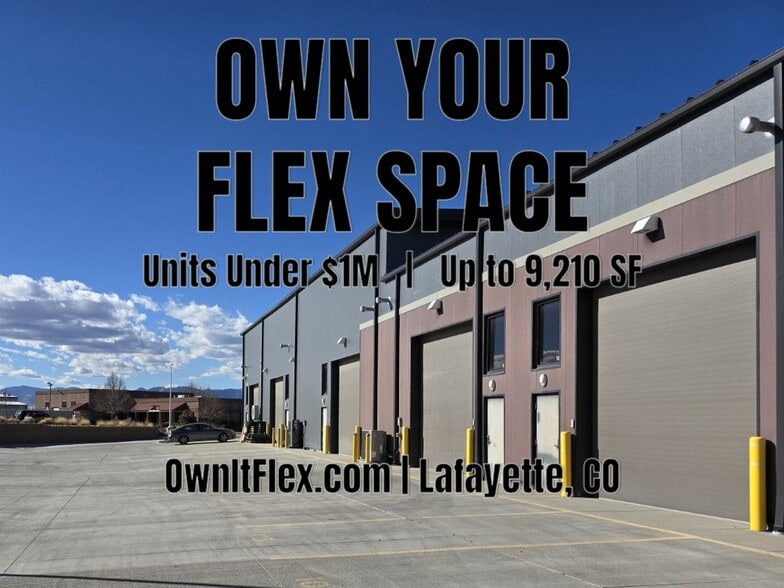 FLEX WAREHOUSE CONDOS FOR SALE | UNDER $1M UNITS | UP TO 9,210 SF CONTIGUOUS Own It Vista is a newly constructed 50,000 SF Class A flex office/warehouse condo project located in Lafayette’s Vista Business Park. Designed for owner-users, these units provide an opportunity to control your space, build long-term equity, and avoid rising lease costs in one of Colorado’s most supply-constrained markets. Only a limited number of units remain. Available units range from approximately 1,850 SF to 3,900 SF, with multiple contiguous configurations available for businesses seeking larger, integrated space. A rare opportunity exists to acquire up to 9,210 SF of contiguous space (Units 102 + 103 + 202), combining two ground-floor warehouse units with a second-floor office. This configuration is ideal for contractors, service companies, and owner-users currently leasing 5,000–10,000 SF who are ready to own and consolidate operations into one location. An additional contiguous option of approximately 7,679 SF (Units 106 + 107) is also available for users seeking a warehouse-focused layout. PROPERTY FEATURES: • New construction – delivered in core and shell condition, ready for build-out • 24’ clear heights in warehouse areas • 14’ x 14’ overhead doors • Heavy power (200A, 3-phase) • High-load concrete floors designed for industrial use • Second-floor units feature large windows and natural light • Shared lobby with elevator and four restrooms • Fiber and coax internet infrastructure available • Professional site design with high-quality landscaping and concrete drives • Ample parking with EV charging stations • Dual site access for efficient ingress and egress LOCATION: Strategically located near US-36 and Northwest Parkway, providing convenient access to Boulder, Denver, and surrounding employment centers. The property is situated near the Medtronic campus and Good Samaritan Hospital, with proximity to established commercial and industrial users. MARKET POSITION: Boulder County continues to experience limited supply of new flex/industrial product, with strong long-term demand from owner-users. Opportunities to acquire new construction space—particularly in contiguous configurations—are extremely limited. Own It Vista offers a practical alternative to leasing, allowing businesses to stabilize occupancy costs and invest in their own facility. For pricing, availability, and unit details: www.ownitflex.com