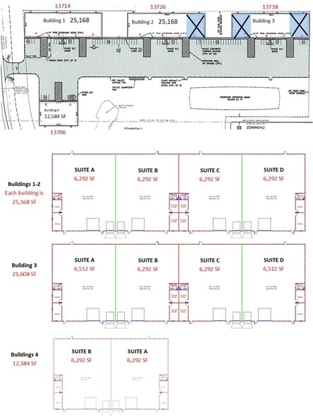 New Construction. Multiple Space options available within 4 Buildings ranging from 6,292 to 69,432 SF total available. $6.25 PSF to $6.50 PSF depending on size Building 1-2 are approximately 25,168 SF each, Building 3 is approximately 25,608 SF, and Building 4 is approximately 12,584 SF. Building 3 (13738) suite D is leased.