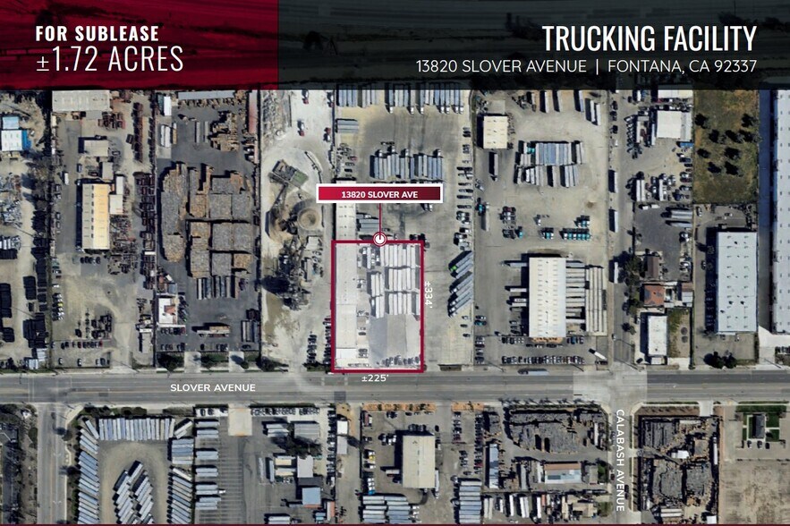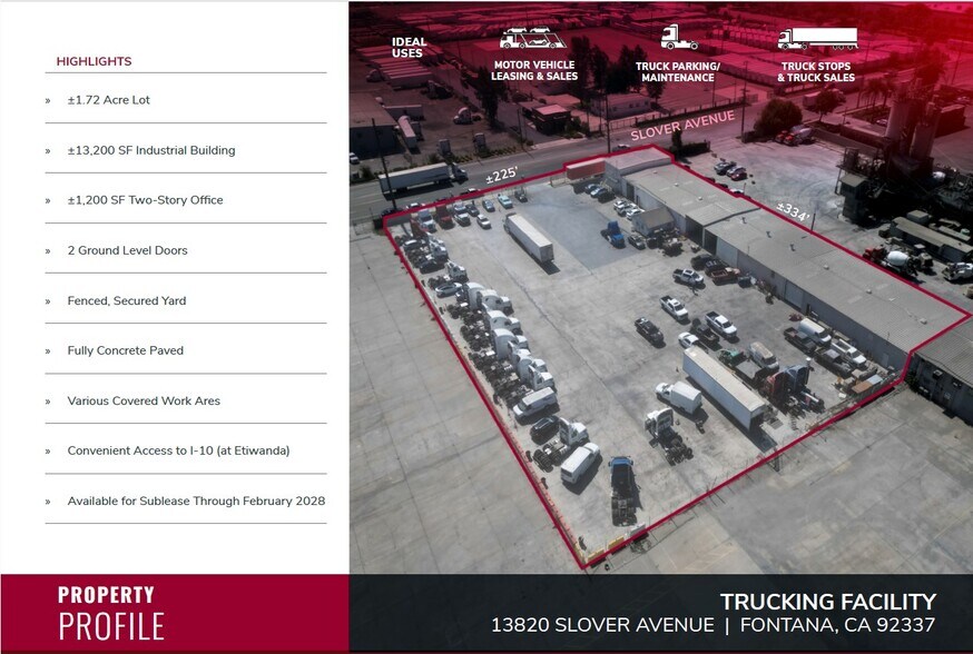Situated on approximately ±1.72 acres, this well-equipped trucking facility offers a prime industrial opportunity in Fontana, California. The property features a ±13,200 square foot industrial building, which includes a ±1,200 square foot two-story office space. Designed with functionality in mind, the facility is equipped with two ground-level doors and offers various covered work areas to support a wide range of operations. The site is fully concrete paved and includes a fenced, secured yard, ideal for trucking, storage, or distribution-related activities. Conveniently located near the I-10 Freeway at Etiwanda Avenue, the property provides excellent regional access for logistics and transportation. This facility is available for sublease through February 2028, making it a strategic option for businesses seeking immediate and flexible industrial space in the Inland Empire