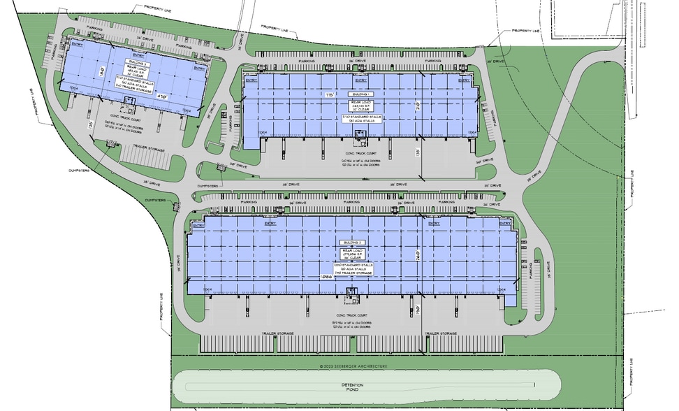 - 6" CONCRETE SLAB ON 10 MIL. VAPOR BARRIER - CONCRETE TILT WALL PANELS - ESFR FIRE SPRINKLED - 32' CLEAR HEIGHT. - IIB CONSTRUCTION - 20 OVERHEAD DOOR COUNT: 18 (9' x 10') + 2 (12' x 14') @ RAMP - 14 TRAILER STORAGE - 118 TOTAL PARKING: 112 STANDARD + 6 ACCESSIBLE STALLS