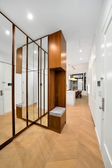 Each approximately 1,300 SF residence offers full-floor privacy and an efficient, functional layout. Living areas are positioned at the front of the building to maximize light and views, while bedrooms, walk-in closets, and spa-like bathrooms are quietly located toward the rear. Interiors feature white oak chevron flooring, custom European millwork, Viking ranges, Bosch appliances, and carefully integrated storage throughout.