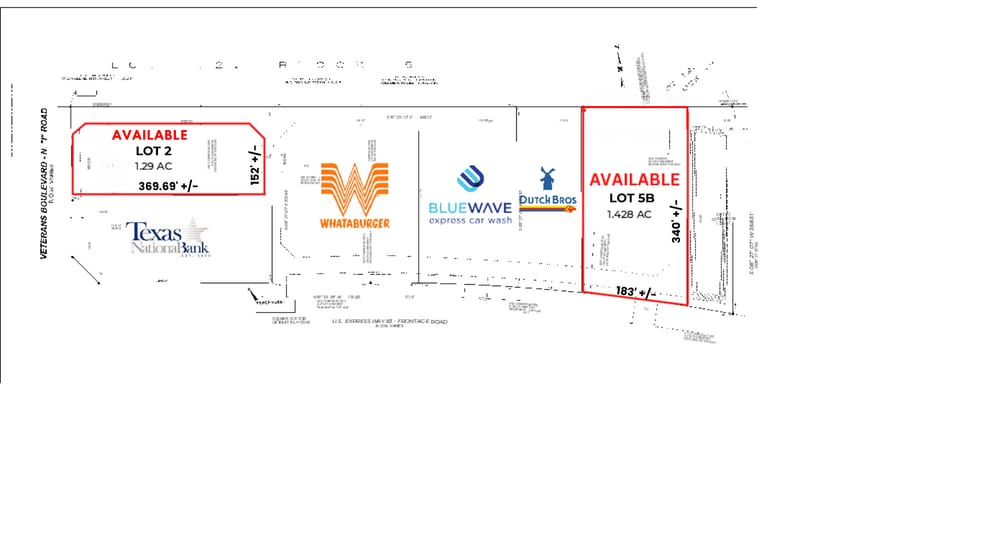 Two remaining pad site fronting Interstate 2 in San Juan, TX. Bluewave Express, Whataburger and Dutch Bros Coffee are among the co-tenancy line up. Ideal from a logistics point of view sitting in the mid-valley and being down the street from the signal-controlled intersection of North Veterans Blvd. The site is surrounded by attractions including; HEB, CarMax, Burger King, Taco Palenque, Wing Barn, Lexus, Jack in the Box, and many more.