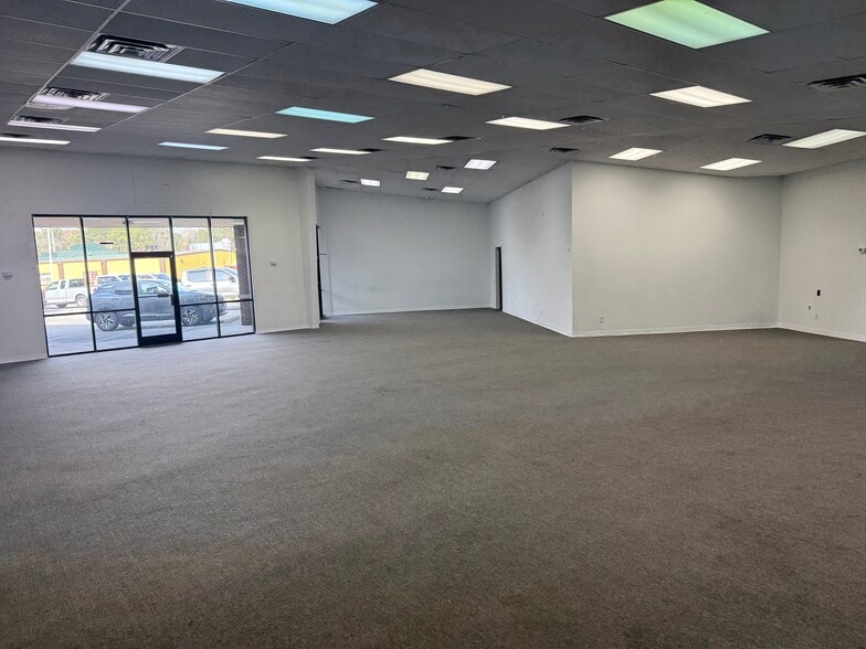 This corner unit can be divided back into two separate spaces. Each unit has a bathroom and separate front and rear access. Large shared parking lot as well. Across from Lowes and Publix.