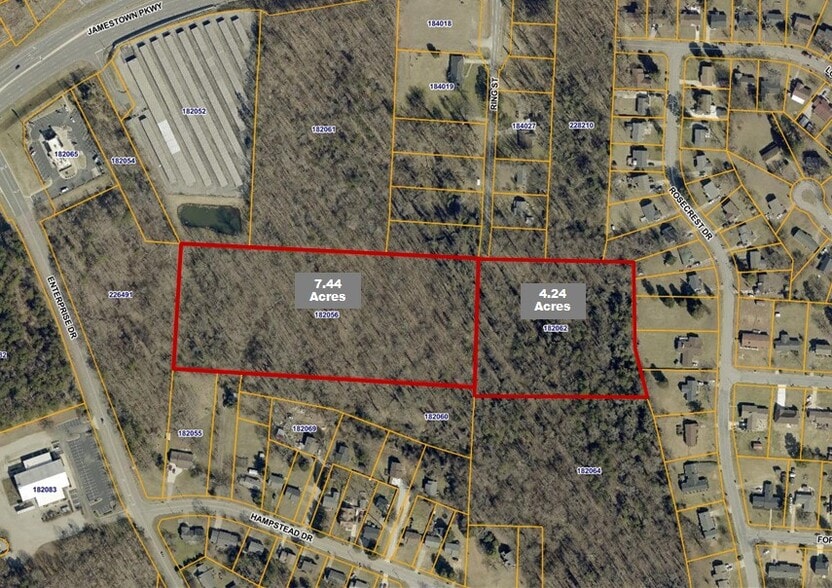 Two parcels of gently sloping land, totaling 11.68 acres. Located just off Jamestown Parkway , accessible via Ring street. Area is designated mixed-use corridor/center in High Point 2045 Comprehensive Plan