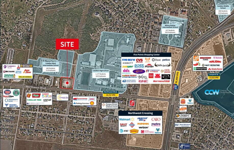 Former branch bank redevelopment opportunity in the heart of Calallen, featuring prominent frontage along high-tra?c Northwest Boulevard. Ideally posi oned adjacent to Calallen High School and within the area’s primary retail corridor. The property o?ers excess land suitable for building expansion, a QSR build-to-suit, ground lease, and/or addi onal parking. Opportuni es in this submarket are extremely limited, supported by strong tra?c counts and favorable demographics. The exis ng building may also be configured to accommodate mul ple tenants.