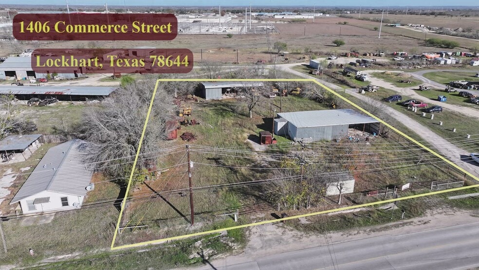 1 Acre lot located on a major commercial street in Lockhart, Texas. Commerce Street, get it? Zoned Heavy Industrial with public utilities on site or available including 3 Phase electrical service. There are 3 Metal Buildings for auto or equipment repair and workshops. The perimeter is fenced and there are two curb cuts onto the roadway. Many uses are allowed, including manufacturing. Several of the many Big residential developments being built in Lockhart are just down the road, making this a great location for investment and business operations.