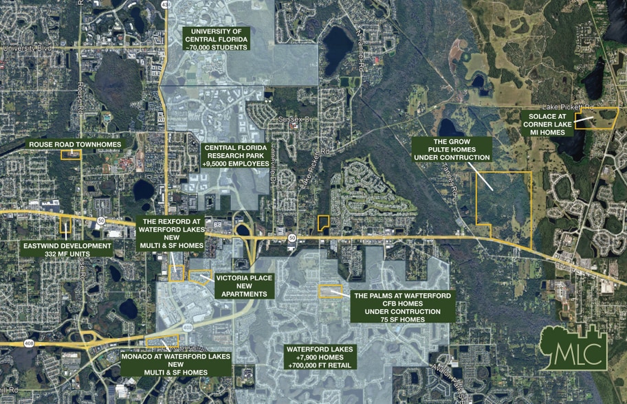 This 11-acre property near E. Colonial Drive features 645 feet of frontage on Fricke Road. This property offers exceptional visibility to 45,500 daily drivers and excellent connectivity to major transportation routes, including the nearby SR 408 East-West Expressway. The site is ideally suited for residential development and benefits from its close proximity to key activity centers. It is located near a Walmart Supercenter, just ten minutes from the University of Central Florida (UCF), and Waterford Lakes Town Center, one of the region’s premier retail and entertainment destinations, providing both convenience and strong market appeal for future residents.