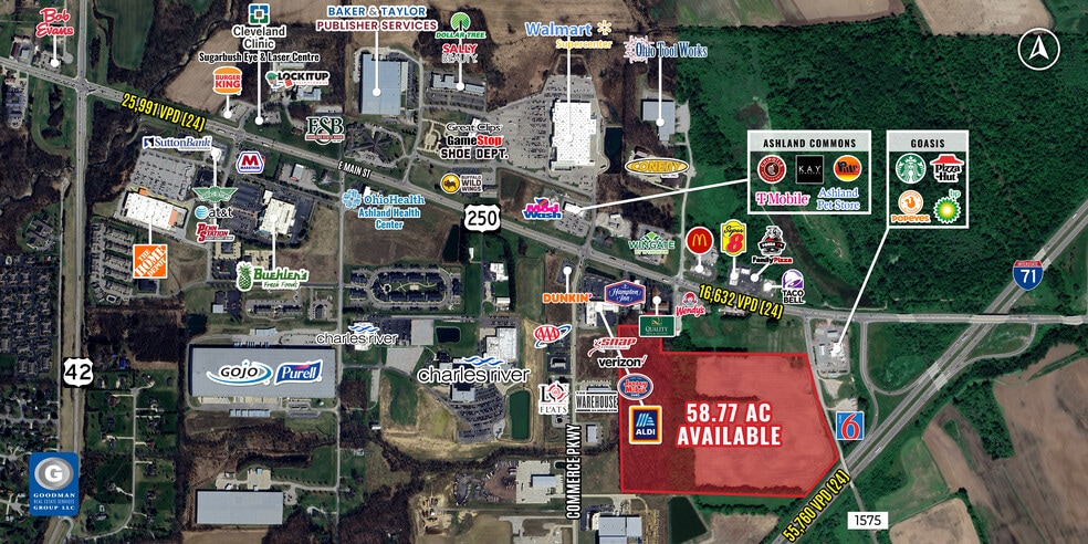 58.77 AC DEVELOPMENT SITE FOR SALE - Back on the Market LOCATION: US Route 250, directly off of Interstate 71 ZONING: M-4 Industrial and Business Park District. The site has been designated a Community Entertainment District, which is designed to create an area along East Main Street for restaurants, hotels, shopping and entertainment. The district is bordered by George Road on the west, East Main Street on the north, and Interstate 71 on the east. TRADE AREA ANCHORS: Walmart Supercenter, The Home Depot, Aldi AREA EMPLOYERS: GOJO, Baker & Taylor Publisher Services, Charles River Labs, Ohio Tool Works