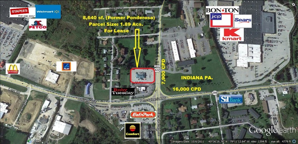 Former (8,640 sf.)Ponderosa Restaurant Bldg. sits on a Parcel size of 1.89 Acres with 139 parking stalls. The parcel has cross - easement access with Ruby Tuesday at the highly trafficked corner of Oakland Av. & Indian Springs Rd. in Indiana Pa. Indiana Pa. is home to 15,000 students at IUP. The site is located on the main retail/restaurant highway Rte. 286 (Oakland Ave.) which is home to the Regional Mall, the Wal-Mart Center, and the majority of restaurants & hotels in the region.