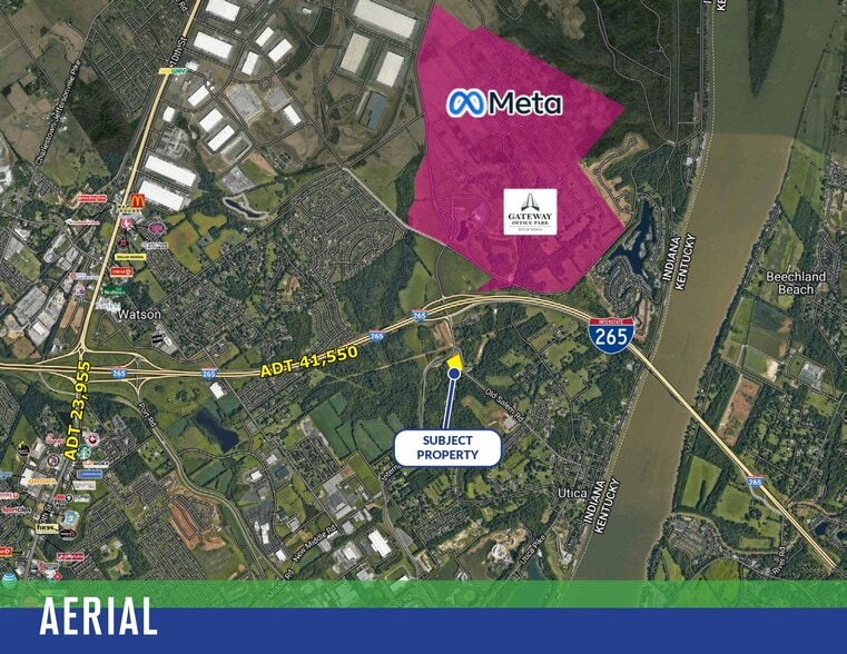 Excellent land frontage across I-265 from River Ridge development. Massive 6,000 AC site River Ridge Commerce Center that just announced $800M META project. Please see https://www.riverridgecc.com/ for updates on nearby projects. Also 1 exit from Eas
