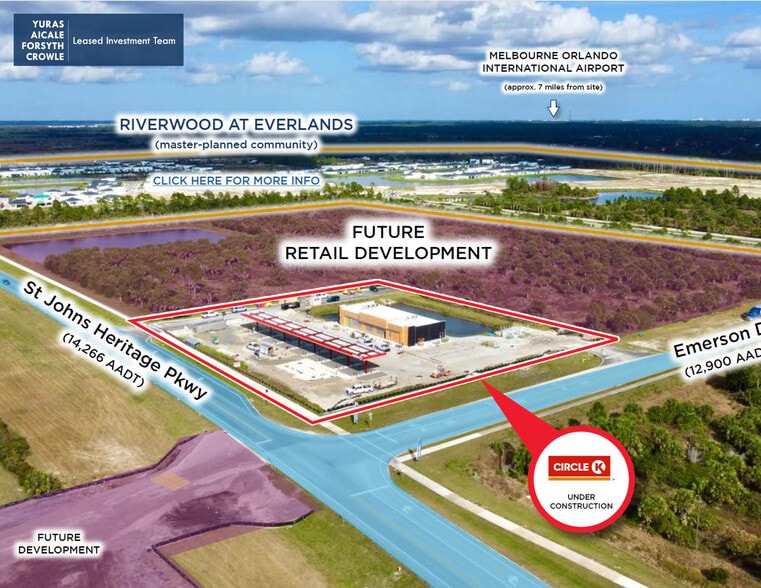 High-visibility and easily accessible location at the intersection of Emerson Drive Northwest and St. Johns Heritage Parkway. Circle K operates more than 16,000 locations globally, demonstrating financial stability and brand resilience. The five-mile radius serves an affluent and populous region of 65,531 residents, with an average annual household income of $107,348. Built in 2026, the 5,200 SF property is designed specifically for Circle K’s operational needs. The absolute NNN ground lease structure transfers all maintenance and expense obligations to the tenant, including the roof, structure, and parking lot. Projected population and income growth within the 1-, 3-, and 5-mile radii support long-term stability for both Circle K and the Palm Bay market.