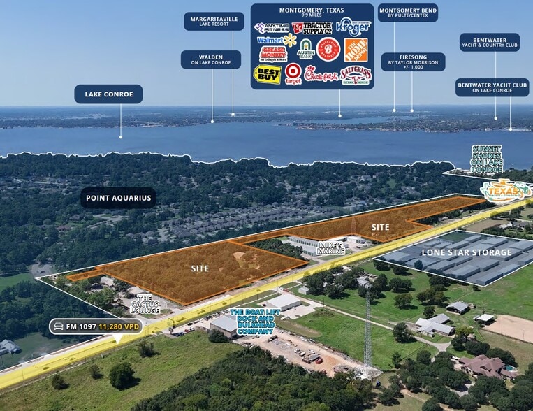 Will subdivide this +/- 21.25 acre development site located on 14217 FM 1097 West Road that is situated within the rapidly growing Willis market in Montgomery County. Bordering Point Aquarius, this tract offers great visibility, three points of access along FM 1097, and one point of access on Point Aquarius Boulevard in a high-traffic area. With dual frontage on FM 1097 West Road of +/- 635 feet and +/- 534 feet, this site presents a prime opportunity to enter this strategic location with immediate ingress and egress into Willis, Montgomery, Conroe, and Interstate 45 which is further enhanced by the widening of FM 1097 West Road. The Eastern position of this site has access to available utilities by Point Aquarius MUD, supporting a wide range of development opportunities including residential, commercial, or mixed-use projects. While lying roughly 1/4-mile East of Lake Conroe, the site is free of any floodplain or floodway and is unencumbered by any zoning restrictions. With detention to be determined, the property offers tremendous flexibility in site planning. The site is ideally placed to capitalize on the explosive growth of Montgomery County and surrounding communities that have spurred a host of new developments, like the future Willis ISD High School Complex, providing a rare opportunity to secure a significant land position along one of the area’s major thoroughfares
