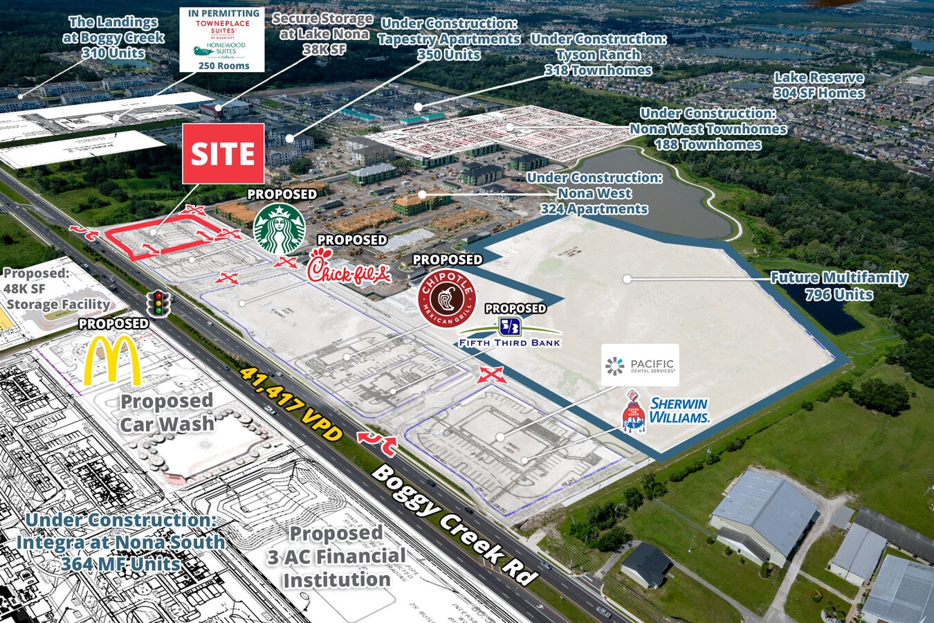 Available multi tenant building for lease or single tenant ground lease. Located in the Lake Nona Submarket with direct frontage on the recently widened Boggy Creek Rd. Site is part of a 115-Acre Master Planned Community by DR Horton with 188 Townhomes and 796 Luxury Multifamily Units. Boggy Creek widening construction is now complete with 4 lanes of traffic. Lake Nona has been experiencing exponential growth, with an addition of over 1,300 residential units adjacent to the property.