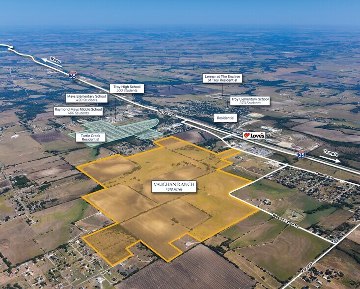 Approximately ±518 acres of raw land located along Church Street in Troy, Texas, within the Temple-Killeen growth corridor. The property is positioned near Interstate 35 and benefits from excellent regional connectivity and visibility. With nearby utility access and minimal municipal restrictions, Vaughan Ranch provides a flexible development canvas for residential, mixed-use, or commercial uses. The property is surrounded by growing residential neighborhoods and supported by favorable demographics, making it a prime candidate for future development.