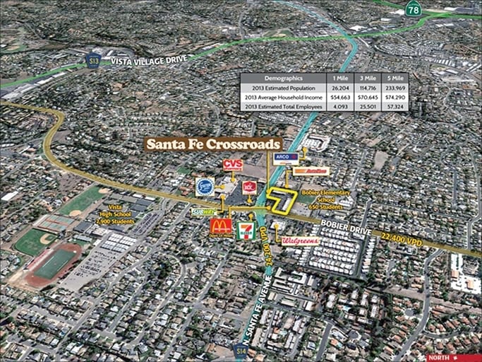 Positioned at the high-visibility, signalized intersection of N. Santa Fe Avenue and W. Bobier Drive, this premier Vista retail location offers exceptional stability and long-term investment appeal. The center sits along a major commercial corridor with traffic counts exceeding 40,000 vehicles per day, benefiting from strong surrounding tenant synergy and a rare infill position in a high-barrier Southern California market. The property is anchored by a McDonald’s outparcel (NAP) and is surrounded by nationally recognized retailers including Stater Bros., CVS, and AutoZone, driving consistent consumer activity and reinforcing the site’s retail strength. Vista continues to experience rapid redevelopment and population growth, supported by excellent demographics with more than 238,000 residents and average household incomes above $113,000 within a five-mile radius. The area’s transformation is further propelled by nearby residential projects such as the 305-unit Persea Luxury Apartments and over 100 additional units under construction within one mile. Immediate access to CA-78—just two miles away—provides seamless connectivity to Interstates 5 and 15, linking the property to San Diego, Orange County, and the Inland Empire.