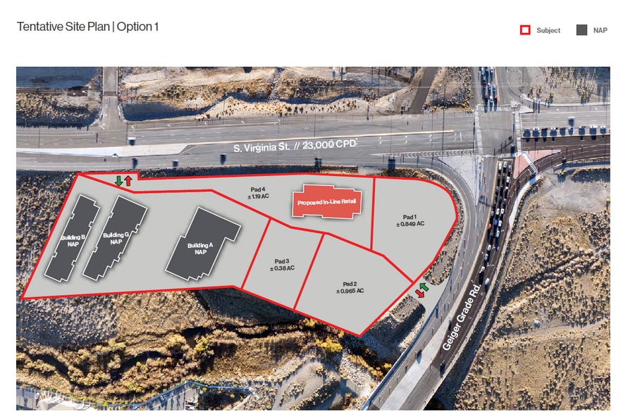 Steamboat Business Park Retail Pads – Build-to-Suit or Ground Lease South Reno | Mt. Rose Hwy/Geiger Grad/South Virginia Intersection Available Retail Pads Pad 1: 0.849 Acres Pad 2: 0.965 Acres Pad 3: 0.38 Acres Pad 4: 1.19 Acres • Flexible boundary lines • Can accommodate a single user up to 3.38 Acres total • Ideal for QSR, gas station, C-store, drive-through, or standalone retail Delivery Condition: Pads delivered rough graded with utilities stubbed to site. New Construction – In-Line Retail (Pad 4) Pre-leasing a brand-new multi-tenant retail building. • Suite sizes: 2,500 – 10,000 SF • Flexible demising • TI packages available • Inquire for pricing Access & Infrastructure • Approved right-in/right-out from Geiger Grade Rd • Approved right-in/right-out from S. Virginia St • Dual ingress/egress connectivity through internal drive • Utilities being installed under the connecting drive aisle • Developer breaking ground on earthwork shortly Project Overview Steamboat Business Park is a mixed-use commercial development designed for high-traffic retail users. • 3 standalone retail pads • 1 approved QSR drive-through pad • 1 multi-tenant retail building • Class-A self-storage planned for remaining development Location Highlights • Directly across from The Summit Reno • Immediately south of the proposed Costco Wholesale location • Intersection and roundabout recently upgraded • Anticipated increased traffic from surrounding developments