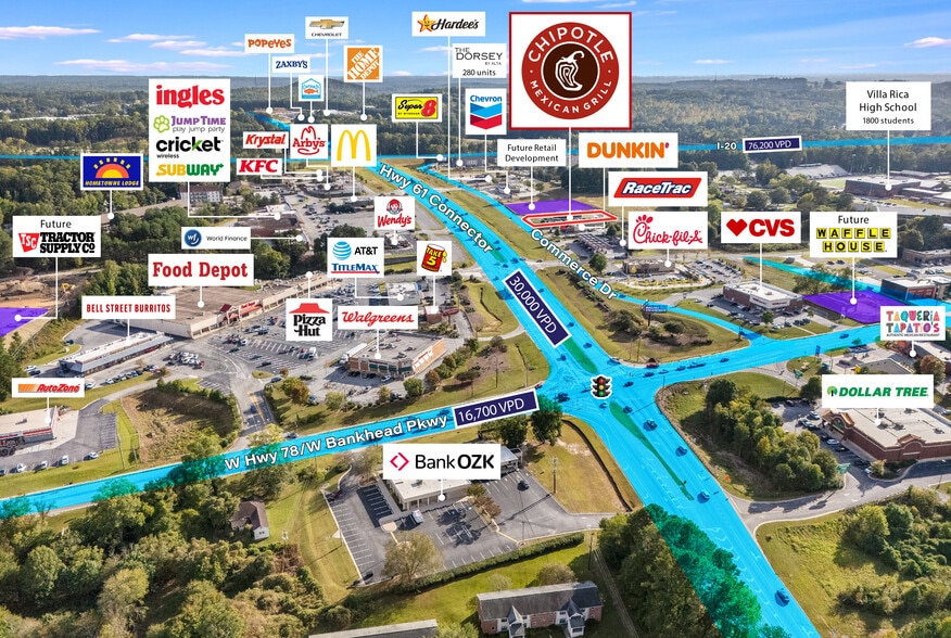Strategically positioned along Highway 61 just off Interstate 20, the property enjoys excellent visibility and access with combined traffic counts exceeding 106,000 vehicles per day. The site sits within Villa Rica’s primary retail corridor, surrounded by top-performing national retailers and essential daily-needs amenities that drive consistent consumer traffic. The surrounding trade area is both affluent and expanding, with over 125,000 residents and an average household income exceeding $88,000 within a 10-mile radius. The population is projected to grow by more than 10% over the next five years, reaching approximately 139,000 residents. Nearby community drivers include Villa Rica High School (1,800 students) and several new residential developments such as The Dorsey by Alta, Rivershire Place, and Arbor Bend, collectively delivering 600+ new housing units.