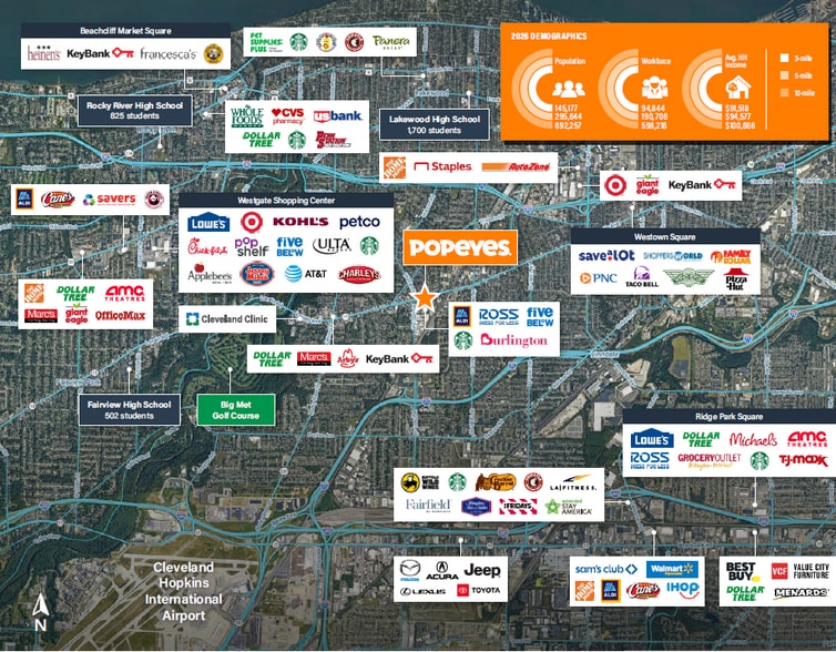Strategically positioned along Lorain Avenue—a major commercial artery connecting West Park, Lakewood, and Downtown Cleveland—the property benefits from strong daily traffic, excellent visibility, and convenient access to I-90 and I-71. The drive-thru format aligns with Popeyes’ high-volume operating model, capturing commuter, residential, and workforce demand from surrounding neighborhoods and employment centers. The site is surrounded by national retailers including Burlington, Ross, ALDI, McDonald’s, Taco Bell, and Rally’s, reinforcing the corridor’s role as a key West Side retail destination.