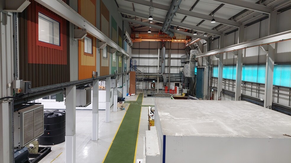 The building comprises a large industrial unit of steel-frame construction and includes a generous provision of first-floor mezzanine offices. The unit benefits from a reception area along with ground floor toilet facilities. The height of the warehouse varies, with the southern section having the greater eaves height. Within the main warehouse area, there is a concrete bunker and a pit which currently holds a water tank.