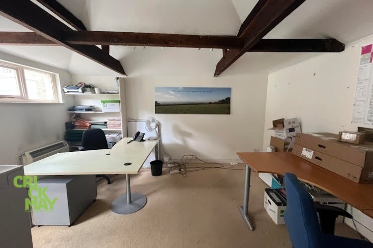 Accessed via the central courtyard, the Western Building provides additional office and staff facilities. The interior features a vaulted ceiling with exposed beams and track-mounted spotlights. The office area is carpeted, with polished concrete finishes to the kitchen and WC.