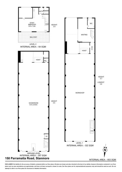 The property at 150 Parramatta Road, Stanmore, is a three-level building totaling 653 m²*. It includes a ground floor showroom, a first-floor workshop, and a second-floor caretaker unit. The site has dual street frontage, rear lane access, and is located approximately 6 km from the Sydney CBD. It is accessible via Parramatta Road and City West Link. The property is council-approved for mechanical workshop use and includes a goods hoist and additional mezzanine storage.