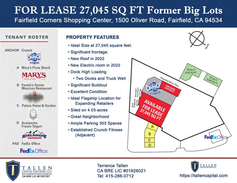 - Located adjacent to a very sucessful Crunch and several of Fairfield's favorite restaurants including Favala Mexican, Mary's Pizza, and more.