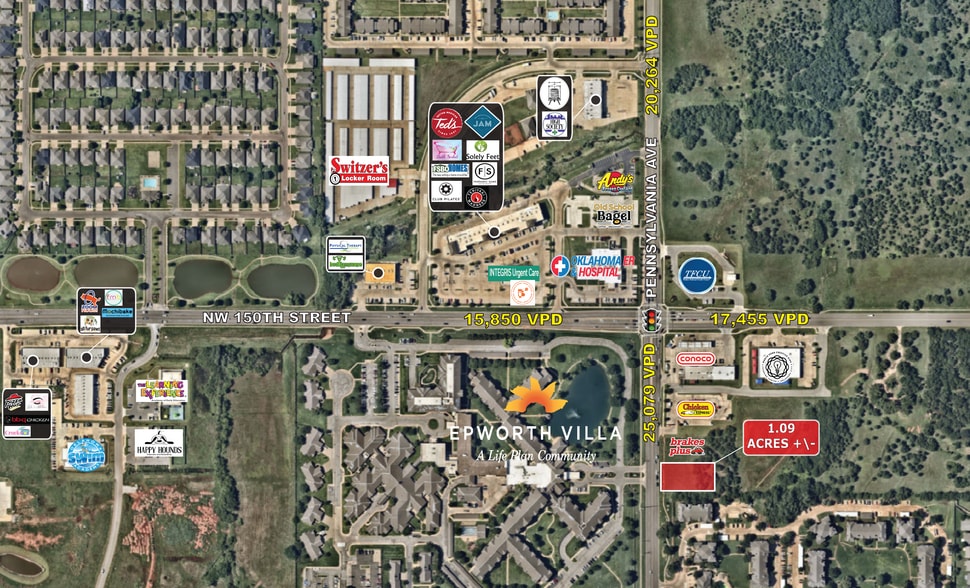 The property is a 1.09-acre parcel located at 15000 N. Pennsylvania Avenue in Oklahoma City, Oklahoma. It is situated near the intersection of NW 150th Street and N. Pennsylvania Avenue, approximately 1.5 miles from the Kilpatrick Turnpike and 2 miles from Lake Hefner Parkway (US-74). The surrounding area includes residential neighborhoods, retail centers, and service businesses. Traffic counts in the immediate area exceed 25,000 vehicles per day. The site is zoned PUD-1069 and has access to water and sewer utilities.