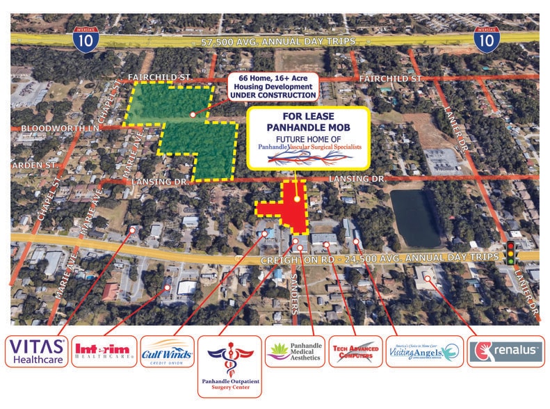 Build to suit - Medical Office Building! Panhandle Medical Office Building is conveniently located on Creighton Road between Florida West Hospital (HCA) and Sacred Heart Hospital (Ascension) with easy access to I-10 and I-110. The building is adjacent to an existing Ambulatory Surgery Center. Suites can be custom designed and built to tenant specifications. A tenant allowance of $40/sf is included in the advertised lease rate of $25.50/sf. Additional TI is available/negotiable based on lease rate and term. One portion of the building has been leased to Panhandle Vascular Surgical Specialists. Parking meets requirement for medical offices.