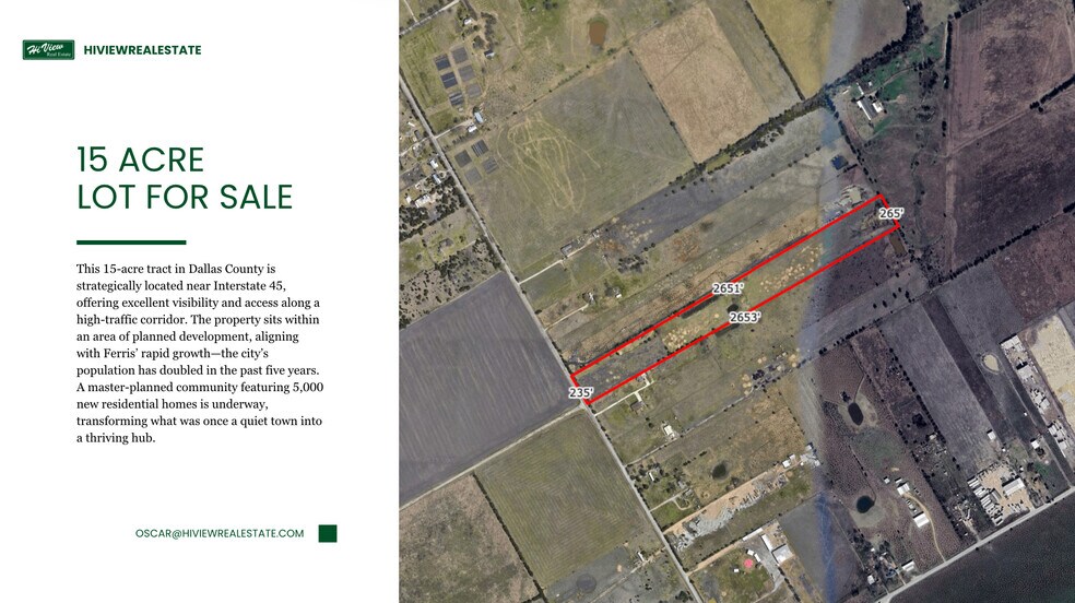 This 15-acre tract in Dallas County is strategically located near Interstate 45, offering excellent visibility and access along a high-traffic corridor. The property sits within an area of planned development, aligning with Ferris’ rapid growth—the city’s population has doubled in the past five years. A master-planned community featuring 5,000 new residential homes is underway, transforming what was once a quiet town into a thriving hub.