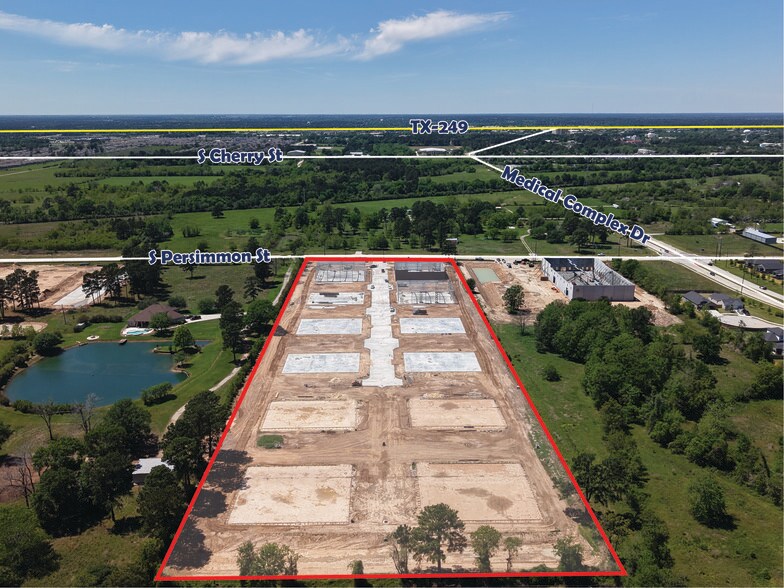 Located on S Persimmon St, just East of T X-249 and less than 3miles north of Grand Pkwy/99, Persimmon Business Park is a 12 building, 114,400 SF deed restricted industrial development. The park provides industrial spaces for various industries. The park includes 18-wheeler accessibility with optional truck wells for each building , 3-phase power, 14x16’ grade level doors, 30’ clear ad 26’ eave height, and all buildings are 5-ton crane ready. Designed with a clean, modern aesthetic with build-to-suit options for the unit interiors. The project has an estimated completion date of Q2 2026.