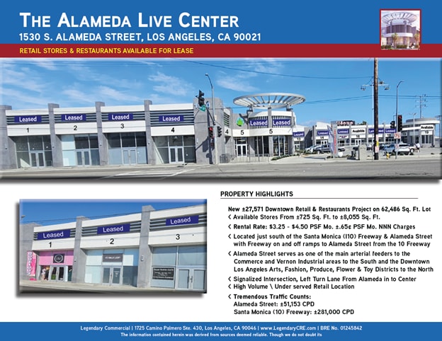 Legendary Commercial Real Estate is pleased to announce the exclusive Authorization to Lease New ±27,571 Downtown Retail & Restaurants Project Known as Alameda Live Shopping Center. The center is on 62,486 Sq. Ft. lot. There are 6 Stores Available Stores Left! From ±850 SF, 855 SF, 1000 SF, 1,120 SF, 1,350 SF, 1675 SF or 2,200 SF if 800 SF & 1,350 SF units are combined. The Rental Rate are at $3.25, $3.95 & $4.50 PSF Mo. ±.65¢ PSF Mo. NNN Charges. The Center is located just south of the Santa Monica (I10) Freeway & Alameda Street with Freeway on and off ramps to Alameda Street from the 10 Freeway Alameda Street serves as one of the main arterial feeders to the Commerce and Vernon Industrial areas to the South and the Downtown Los Angeles Arts, Fashion, Produce, Flower & Toy Districts to the North The center is located at a signalized intersection with a left turn lane from Alameda Street right into Center. Has High Volume Traffic. Tremendous Traffic Counts: Alameda Street: ±51,153 CPD Santa Monica (10) Freeway: ±281,000 CPD