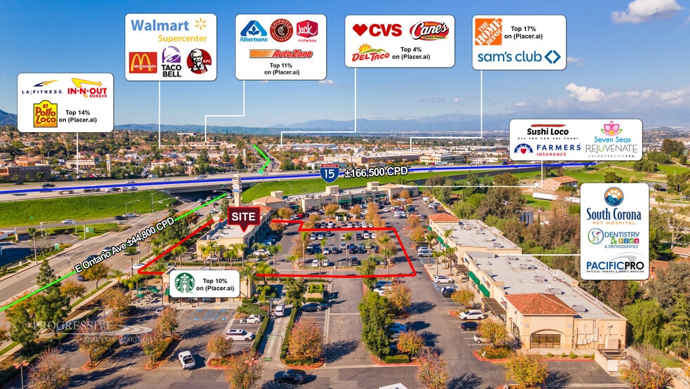 Progressive Real Estate Partners is pleased to present the opportunity to acquire a high-exposure, four-tenant retail asset with a drive-thru end cap located directly o? Interstate 15 at the Ontario Avenue exit in Corona. The property bene?ts from visibility to ±166,500 CPD along Interstate 15 and ±44,800 CPD along Ontario Avenue, which functions as a primary east–west arterial for central and south-central Corona residents accessing the freeway. The drive-thru tenant features second-position placement on the freeway pylon sign, while the building itself is one of the most prominent-positioned within the plaza, o?ering superior visibility and signage exposure along Interstate 15, the freeway on- and o?-ramps, and Ontario Avenue. Situated within a highly a?uent trade area, average household incomes within a one-mile radius exceed $156,900. The center is surrounded by a dense concentration of national and regional retailers that drive consistent daily tra?c and support long-term tenant demand. The tenant mix is service-oriented and internet-resistant, with tenants averaging approximately 13 years of operating history at the property. Tenants operate under triple-net leases with 3% annual rent increases, providing predictable cash ?ow and built-in in?ation protection, while common areas are professionally managed, supporting reduced ownership responsibilities.