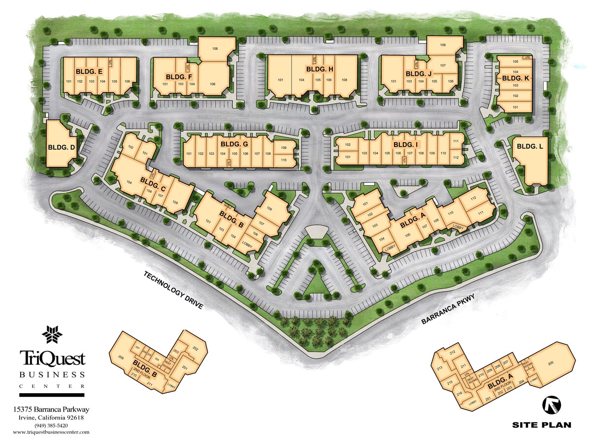 Buildings at TriQuest Business Center feature advanced architectural design that complement the image of established and growing companies. The TriQuest Business Center is centrally located in the heart of Orange County at the intersection of three major freeways. On-site leasing and management. On-site deli and cafe. Suites from approximately 450 - 10,000 square feet. Office, R&D, and Industrial suites available. Industrial suites have ground level roll-up doors. Ample parking available. Parking ratio is 3.75/1000. Pre-improved units available for immediate occupancy. Park-like settings. Master planned 13.7 acre business park. Located in the heart of Orange County' s high tech research and development center. Located at the intersection of 3 major freeways (5, 405, & 133). 1 mile from the Irvine Transportation Center and Rail Station. 1 mile from the Irvine Spectrum. 3 miles from the Irvine Medical Center. 10 minutes from John Wayne Airport.