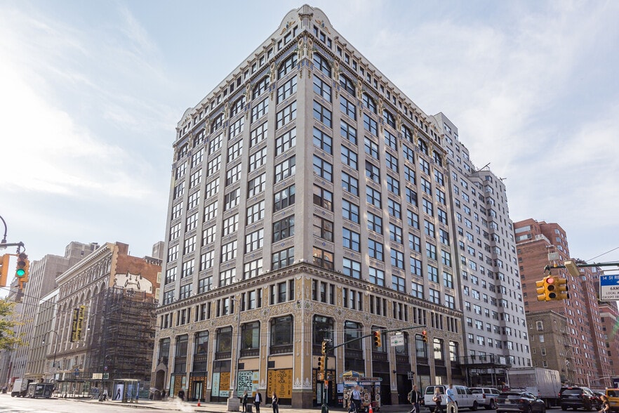 Located in the West Village neighborhood of New York City, 154 West 14th Street is a 12-story leasable office building located at the corner of 7th Avenue and 14th Street. The building was constructed in 1913 by architect Herman Lee Meader and contains 166,626 square feet of rentable area, with typical floor sizes at around 14,400 square feet. The 154 West 14th Street office building features Art Nouveau and Art Deco decorative elements, with its colorful glazed terra cotta facade, scallop detailing, vertical whiplash lines, and geometric medallions. Office tenants enjoy modern amenities including new elevators, an attended lobby, and operable windows for fresh air. Tenants leasing space at 154 West 14th Street offices are close to restaurants, hotels, retail stores, shopping, and entertainment venues. Nearby eateries include Offside Tavern, Chelsea Bagel & Cafe, Westside Market, The Donut Pub, Coppelia, Birch Coffee, Starbucks, and Subway. Local services include Jack’s Computer Services Center, Jo Quality Dry Cleaner, Hollywood 2002 Barber Shop, and Spa Belles 13th Street. Public transportation is just steps away from 154 West 14th Street office space, with the 14th Street Station on 7th Avenue providing access to the 1, 2, and 3 subway lines. The property is only one block away from A, C, E, F, L, and M trains and PATH trains at 14th Street & 6th Avenue and 8th Avenue & 14th Street. Nearby Penn Station offers access to LIRR Commuter Rail and NJT Commuter Rail. Tenants also have easy access to the bus lines of the city and LaGuardia Airport, which is just a 20-minute drive from this leasable office building. The renowned real estate firm The Rosen Group Inc. manages and owns 154 West 14th Street. Current building tenants include Grove Atlantic book publishing, WeWork, and Medical Building Associates.
