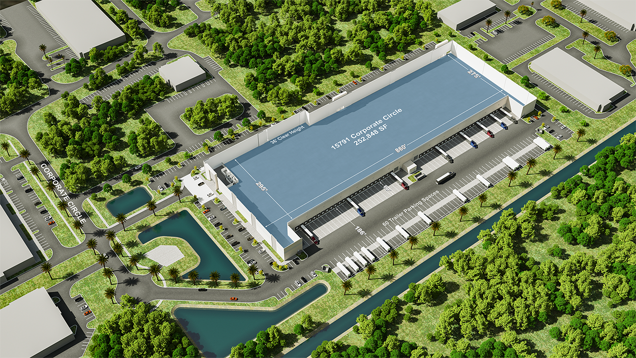 Woodmont Industrial Partners is pleased to offer for lease or sale Corporate Logistics Center, a newly completed Class “A” rear load, dock-high warehouse facility located in the heart of the Palm Beach Park of Commerce in Jupiter, Florida. Corporate Logistics Center, a non-shared truck court, 36’ clear height, state-of-the-art warehouse/distribution facility with trailer parking and outdoor storage, offers a move-in ready solution for businesses seeking a safe and secure corporate park setting, alongside Amazon, Walgreens, FP&L, Niagara and CSX.