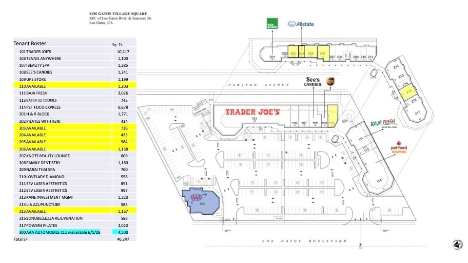 Los Gatos Village Square is a Trader Joe's anchored shopping center located just off the Lark Avenue exit off of Highway 17 along Los Gatos Blvd. There is a dedicated light that allows for full directional ingress and egress to the site. The second level provides opportunity for a combination of office uses and personal services.