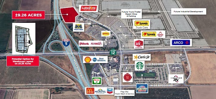 Highly Visible I-5 frontage location w/ significant nearby amenities including Loves & Flying J truck stops, fast food restaurants & truck wash/lube and repair. Immediate access to Interstate 5 and Hwy 12 for ease of distribution throughout Northern California