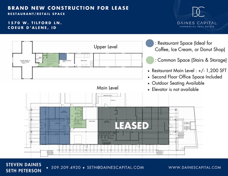Brand-new restaurant/coffee shop space coming soon to Coeur d’Alene! Located at 1570 W. Tilford Ln., this proposed ±1,500 SF main-level suite offers a prime opportunity for a café, ice cream shop, donut shop, or similar food/beverage concept. The building—approximately 7,500 SF total—is set to break ground in January 2026 with an estimated delivery in summer 2026, and includes second-floor office space and outdoor seating options (no elevator). The site features 0.38 acres within the C-17 PUD zoning district, with generous tenant improvements offered at $75/SF and a lease rate of $38/SF NNN. Situated just 1.9 miles from Downtown CDA and surrounded by major amenities, hotels, parks, and strong traffic corridors, this location provides excellent visibility and access for a growing concept in a high-demand area.