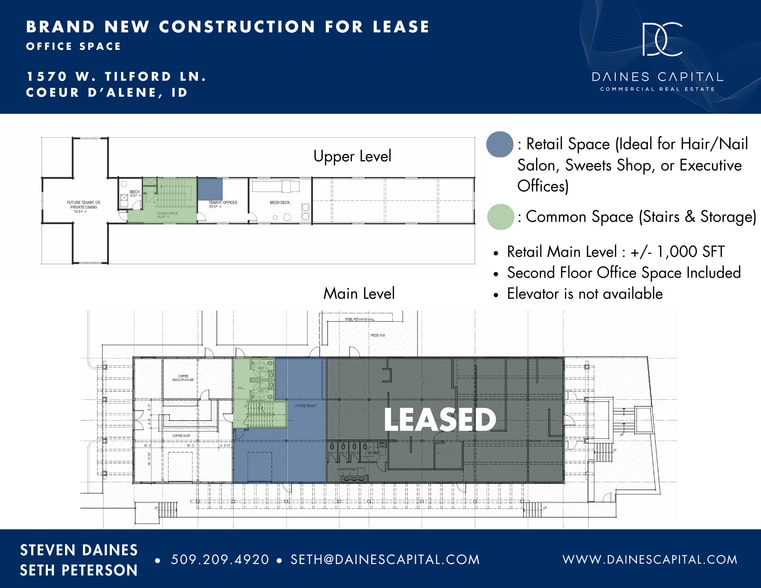Brand-new ±1,000 SF main-level retail space coming soon to 1570 W. Tilford Ln. in Coeur d’Alene. This thoughtfully designed suite is part of a striking ±7,500 SF mixed-use building scheduled to break ground in January 2026, with delivery anticipated in summer 2026. The space includes access to second-floor office areas, shared stair and storage spaces (no elevator), and is ideal for uses such as a hair or nail salon, sweets shop, boutique retail, or executive office setup. Offered at $30/SF NNN with $20/SF in tenant improvement allowance, the building sits on 0.38 acres within the C-17 PUD zoning district and enjoys a prime location just 1.9 miles from Downtown CDA and near major amenities, hotels, parks, and key traffic corridors—providing strong visibility and accessibility for a wide range of retail or service-oriented users.