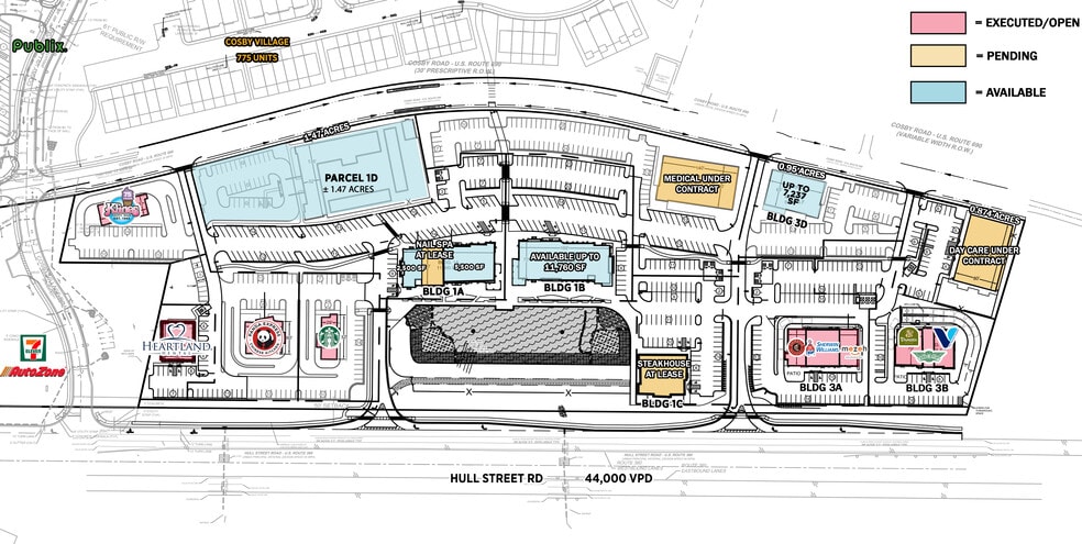 Cosby Village Square is a premier mixed-use development strategically located along Hull Street Road (Route 360), one of the most dynamic growth corridors in the Richmond metropolitan area. This vibrant destination offers a unique opportunity for retailers, restaurants, and office users to position themselves in the heart of Chesterfield County’s fastest-growing residential market. The project features a thoughtfully designed layout with retail spaces ranging from 1,322 SF to 12,363 SF and build-to-suit office or medical sites up to ±1.47 acres. Tenants can take advantage of prime endcap and waterfront patio opportunities, creating an ideal setting for dining and lifestyle concepts. The development also offers purchase and lease options for office users, with generous parking ratios and proximity to Bon Secours St. Francis Medical Center. Cosby Village Square benefits from exceptional visibility and access, with over 44,000 vehicles per day on Hull Street Road and convenient connections to Hull Street, Cosby Road, Otterdale Road, and Fox Club Parkway. The surrounding trade area is anchored by strong demographics, including an average household income exceeding $230,000 within one mile and a rapidly expanding residential base with more than 10,000 new homes approved. This dynamic environment, combined with a curated mix of national and regional retailers, restaurants, and service providers, positions Cosby Village Square as a premier destination for businesses seeking growth and long-term success in the Richmond market.