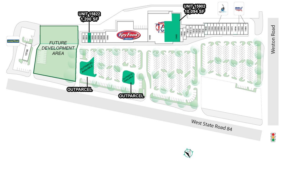 The Rotella Group is the exclusive agent for Westgate Shopping Center, located on 15740 - 15984 W State Road 84 in Sunrise, Florida, Broward County in the Southeast Florida Market. Unit 15902 - 10,094 SF Space Available Unit 15822 - 1,200 SF Space Available (2) Outparcels Available - 1 Acre each Excellent visibility from State Road 84. Next to the City of Weston. Anchored by Key-Food Supermarket. There are approx. 71,062 residents within a 3-mile radius.