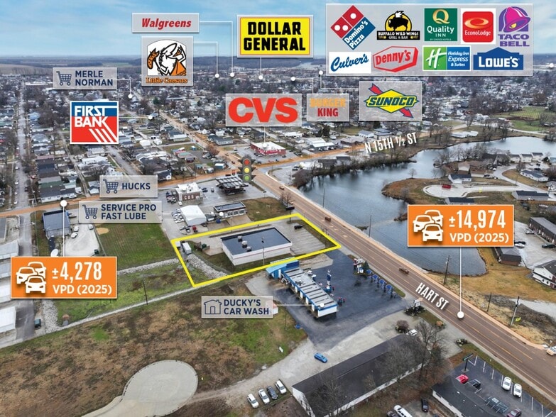 Vincennes, Indiana is a historic river city located on the Wabash River in southwest Indiana, roughly halfway between Indianapolis and St.?Louis, and serves as the county seat of Knox County with solid regional connectivity via U.S. Highways?41 and?50. The local economy is anchored by education (notably Vincennes University), healthcare, manufacturing, and government services, which provide a stable employment base and diversified commercial demand. The Property benefits from frontage along Hart Street (±14,974 VPD) within a dense and established commercial area. Hart Street serves as a major arterial roadway with nearby access to US Hwy 41 (±19,147 VPD) providing excellent regional connectivity. Retail activity is further supported by strong nearby national and local retailers including Walmart, Lowe’s, CVS, Burger King, Dollar General, Culver’s, Walgreens, Aldi, and Hobby Lobby. The Property is positioned within a dense trade area, serving ±23,006 residents with an average household income of $77,091 within a 5-mile radius.