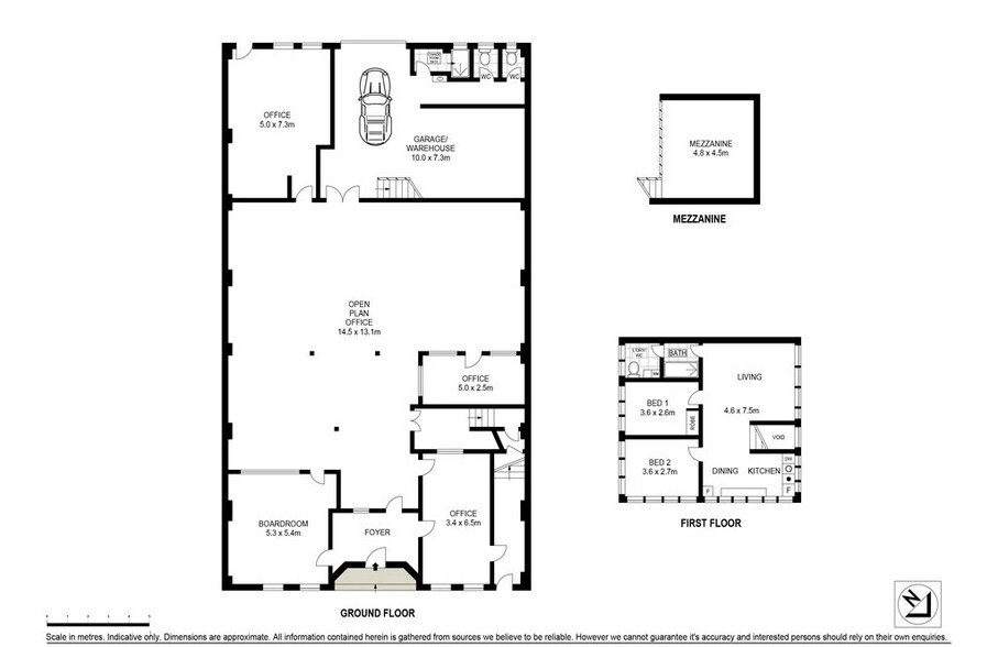 The ground floor features a clear-span open warehouse with soaring factory ceilings, excellent natural light, and built-in storage. Additional spaces include separate offices, a boardroom, and a mezzanine level workspace, providing flexibility for a range of commercial uses.