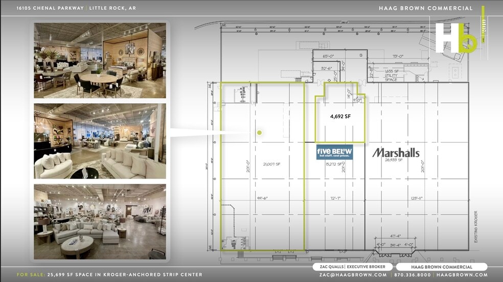The Chenal Shopping Center is a 63,212 SF national tenant power center located in one of the fastest-growing corridors of Arkansas’ largest market. Situated near the state’s largest master-planned community, Chenal Valley, adjacent to a top-producing Kroger, and with the state’s first Costco right next door, the Chenal Shopping Center has solidified its hold as a focal point of retail traffic and easily ranks among the highest regional attractions in Little Rock--a market of over 1M people. With two prominent intersections on each end of the site that contribute to a traffic count of over 36,000 cars per day, this is arguably one of the best pieces of retail real estate in Arkansas. Some of the neighboring restaurants, businesses, and retailers include Chuy’s, Starbucks, Tide Dry Cleaners, Arvest Bank, Westrock Orthodontics, Dental Solutions, HomeGoods, Apple Store, Kohls, Home Depot, Target, Walmart, Whole Foods, and Academy Sports. The site also sits just South of The Promenade at Chenal, a high-end, open-air lifestyle center located in Chenal Valley. The Chenal Shopping Center houses a diverse group of tenants with long-term leases in place. The lineup includes Kroger Marketplace, Walk-On’s, and a pair of national credit tenants: 5 Below, one of the fastest-growing retailers in the country, and Marshalls, a popular retailer offering items from vendors around the world. The 21,007 square-foot inline space, formerly occupied by HOWSE, a regional furniture group, is currently available for lease, as well as, an additional 4,692 SF bonus space, located behind Five Below at the rear of the building.