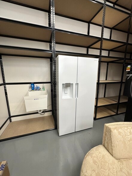 Space currently includes storage shelving along the walls and in the rear of the space. Owner currently has no plans to remove the shelving.