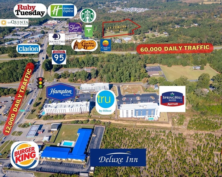 Strategically located just off Interstate 95 and Cedar Creek Road, featuring Traffic Counts on I-95 of 60,000 VPD and Cedar Creek Rd of 12,000 VPD, this ±18.57-acre property offers exceptional visibility and development potential within Fayetteville’s high-traffic retail and hospitality corridor. Surrounded by major national brands such as Cracker Barrel, DoubleTree by Hilton, multiple hotels, and a Tesla Supercharging Station, the site benefits from strong regional traffic and tourism activity.