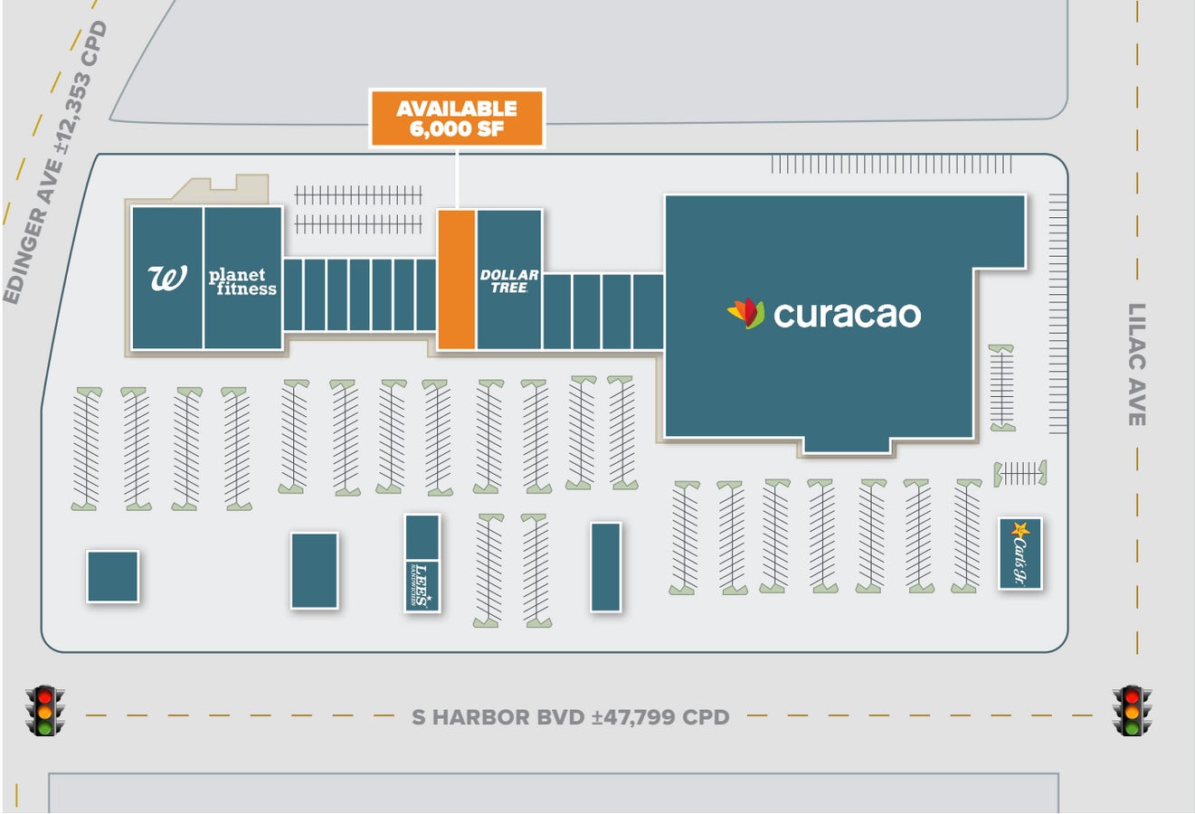 Located at the very busy intersection of Harbor and Edinger in Fountain Valley between the 405 and 22 Freeways. Services a high density and diversely populated trade area, including two area high schools with nearly 4,000 students. Part of a larger power shopping center anchored by La Curacao, Dollar Tree, Planet Fitness and Walgreens. Prominent Monument Signage on Harbor Blvd available