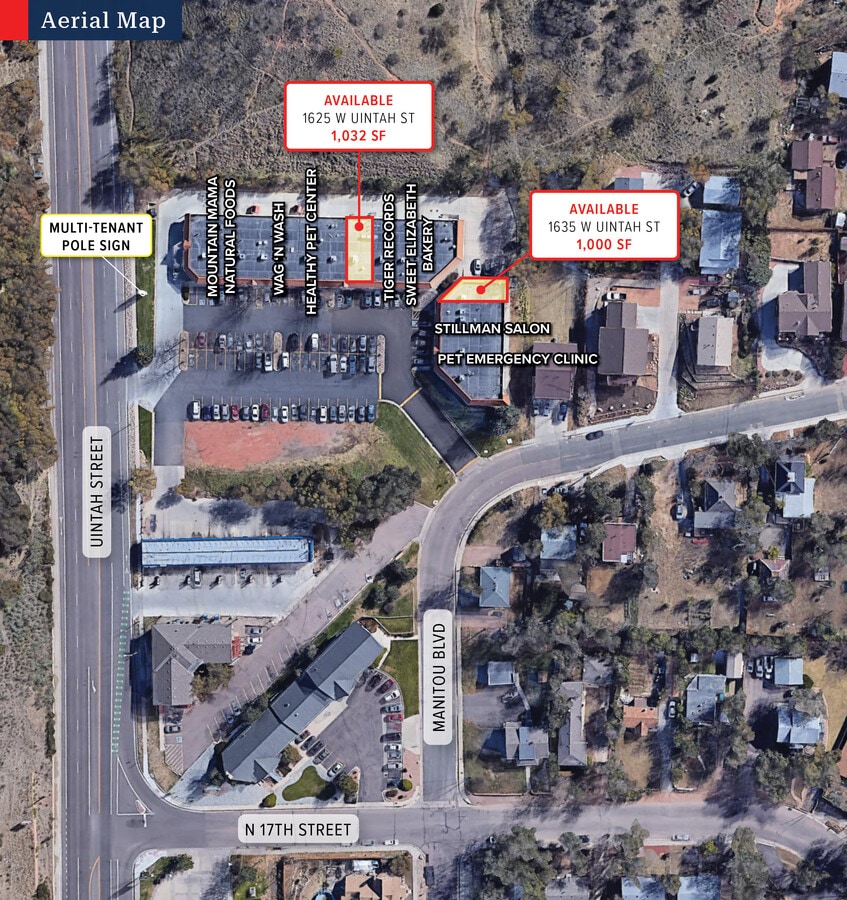 Excellent visibility and access to Uintah Street with convenient and easy access to I-25 and U.S. Hwy 24, the Central Business District and Old Colorado City Adjacent to great traffic generator Mountain Mamas Natural Foods, Wag N’ Wash, and Pet Emergency Clinic Tenant finish negotiable