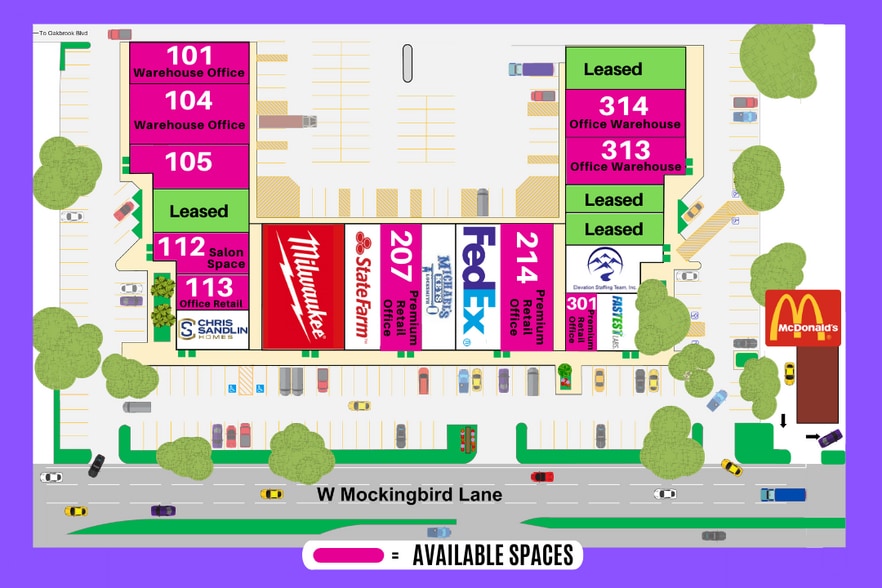 The 1625 Mockingbird location is centrally situated, offering a premier commercial property site to meet your business needs. These single-story building suites feature modern materials, a high-quality design, and are currently in the final phase of a comprehensive remodel. Tenants enjoy the convenience of concierge maintenance services, with local family ownership having reinvested over $3,000,000 in property improvements over the past five years. Fully funded 2023 maintenance and beautification programs ensure the property remains pristine, making it a highly sought-after commercial space lease. This commercial location spans all over 3+ acres of beautifully landscaped grounds, featuring more than 10 large live oak trees aged over 150 years and meticulously maintained zero-scaping flower beds. Employees and visitors alike can relax and take peaceful breaks under the shade of these trees, enhancing the tranquil and professional atmosphere of this business space. Positioned in the heart of the Stemmons Corridor Business District, 1625 Mockingbird Business Park is located near key amenities. Just west of Dallas Love Field Airport and Highland Park, the property is two blocks from UT Southwestern Hospital, Parkland Hospital, and Children’s Hospital. Its close proximity to I-35, only three blocks away, ensures seamless transportation options. Additionally, a Federal Express Office Ship Center within the complex simplifies shipping logistics, making it an excellent choice for businesses seeking office space near me for rent or commercial space for rent. Dining options abound within a three-block radius, offering something for every taste. Nearby favorites include Aloft Dallas Hotel, Starbucks, Chipotle, Smoothie King, Jimmy John's, Raising Cane's, and In-N-Out Burger. For a local flavor experience, the iconic Sonny Bryan's Smokehouse in the Dallas Medical District is a top destination for some of the best barbecue in the area. Businesses thrive in this commercial property site, leveraging its location to serve clients throughout Dallas, Irving, Addison, and Highland Park. With easy access to major highways, tenants in this office space rent dallas enjoy unmatched connectivity, making this property an excellent option for businesses seeking office space arlington or office rental space fort worth. These office and retail spaces are meticulously designed with impeccable finishes. Options for 12' ceilings with exposed HVAC vents and iron beams create a modern industrial aesthetic, while 9' ceilings with 2' x 2' reveal-edge acoustic tiles provide a polished look that reduces noise transfer. Additional features include 100% LED energy-efficient motion-activated lighting, replaceable carpet tiles paired with wood plank flooring, and sleek floor-to-ceiling windows outfitted with light-filtering roller shades. Breakrooms come fully equipped with soft-close cabinetry, dovetail drawers, quartz countertops, under-mount stainless steel sinks, and Delta pull-down faucets. Additional upgrades are available to meet specific business needs. Energy efficiency is a top priority for us, with all roofs upgraded to TPO systems maintaining R-29 insulation values. Outdoor parking areas, building exteriors, and entrances are well-lit with LED lighting, providing a safe and welcoming environment for tenants and their guests. For businesses searching a commercial space to rent or office space dallas, 1625 Mockingbird Business Park offers superior amenities and a prime location. Positioned within the southwest Dallas Medical District, our property is an excellent choice for businesses seeking office space available near me or office space in fort worth. Schedule a call today to explore the available office, retail, flex, and warehouse spaces. With high demand in this thriving district, this commercial location is the ideal place for your business to succeed and grow.