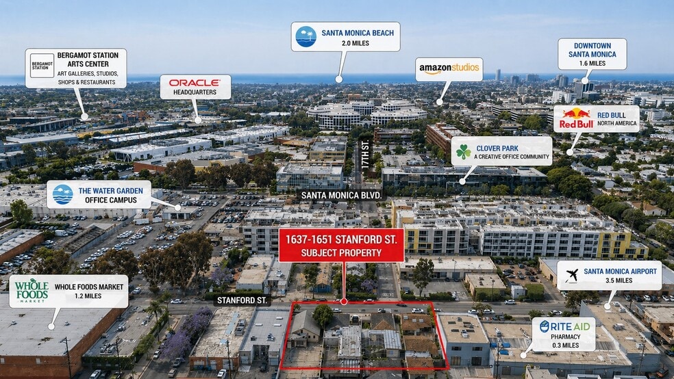 1637–1651 Stanford Street offers a rare ±23,134 SF (4-parcel) development opportunity in the heart of Santa Monica’s highly sought-after SMLMSD (Light Manufacturing & Studio District). Ideally positioned within the city’s premier creative and tech corridor, the property is surrounded by major employment hubs including the Water Garden, Bergamot Station Arts Center, and corporate offices for Oracle, Amazon Studios, and Red Bull. The site benefits from excellent connectivity, proximity to transit, and a dynamic mix of residential, creative office, and retail uses.